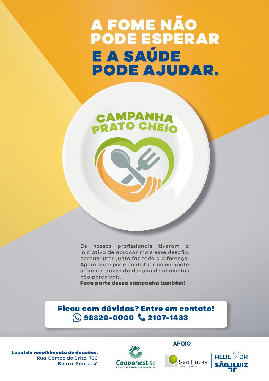 Campanha Prato Cheio. Este é o nome da campanha promovida pelo Hospital São Lucas e com a parceria da Cooperativa dos Anestesiologistas de Sergipe (Coopanest-SE), que busca arrecadar alimentos e itens de higiene e limpeza para ajudar as famílias afetadas pela pandemia do novo coronavírus, além de fortalecer a rede de solidariedade formada por entidades sociais, empresas doadoras, voluntários e comunidade em prol da redução das carências alimentares da população em vulnerabilidade social.