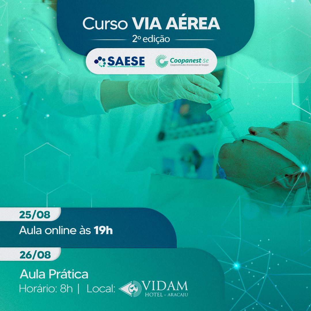 A Sociedade de Anestesiologia do Estado de Sergipe (Saese) realiza nos dias 25 e 26 de agosto a 2ª edição do Curso do Controle Básico da Via Aérea. O evento contará com aula teórica online, às 19h, no dia 25. E na manhã da quinta (26), a aula prática acontece no Vidam Hotel, em Aracaju.