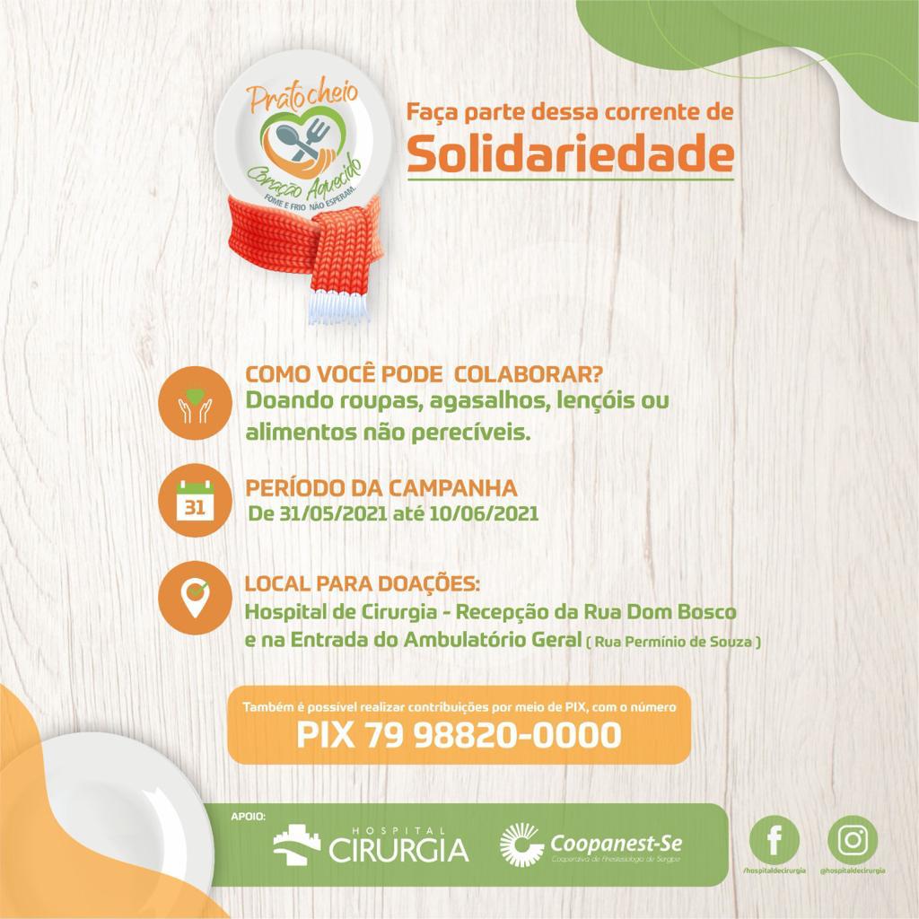Campanha Prato Cheio + Coração Aquecido é o nome da campanha promovida Cooperativa dos Anestesiologistas de Sergipe (Coopanest-SE) em parceria com o Hospital Cirurgia que busca arrecadar alimentos, roupas usadas e itens de higiene e limpeza para ajudar as famílias afetadas pela pandemia do novo coronavírus.